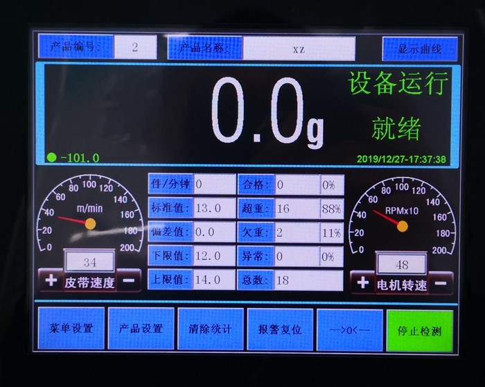 2、產(chǎn)品進(jìn)入到檢重秤的“稱重段”:稱重系統(tǒng)迅速檢測(cè)出產(chǎn)品的重量;并立即作出判斷產(chǎn)品重量是否在目標(biāo)重量范圍內(nèi)。若產(chǎn)品重量合格,則無誤的傳送出檢重秤;若產(chǎn)品重量不合格,則會(huì)給出剔除延遲信號(hào)。與此同時(shí),系統(tǒng)會(huì)自動(dòng)記錄產(chǎn)品合格數(shù)量和不合格的數(shù)量。
