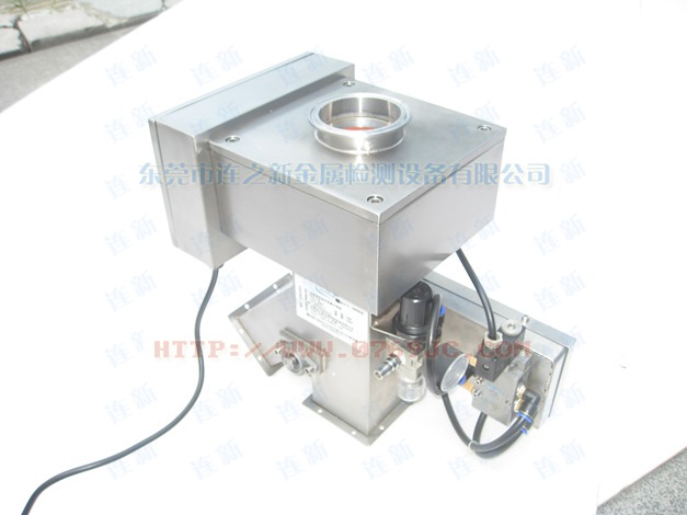 原料從料斗或送料器自由下落進入金屬分離器,如果沒有金屬雜質,原料會直接通過金屬分離器流向下端的出料口。如果檢測器檢測到原料中含有金屬,那么控制器立刻啟動分離板將金屬物和部分原料一起導向側面的排料口,然后分流板迅速恢復至正常的位置,分流板速度可調,金屬分離器的檢測精度也可根據生產需要調節,最小可檢測并分離出Φ 0.2mm的金屬顆粒。